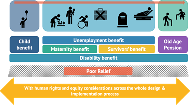 An inclusive lifecycle social protection system (see figure 2) requires governments to base their policy design and programme implementation on human rights principles and build national legal and regulatory frameworks that acknowledge the right to social protection and the right to an adequate standard of living. Since individuals of all ages are rightsholders and vulnerable to shocks and risks of different types (including pandemics), governments need to ensure that people are covered throughout their lifecycle, making sure dignity is at the core of any social protection system.