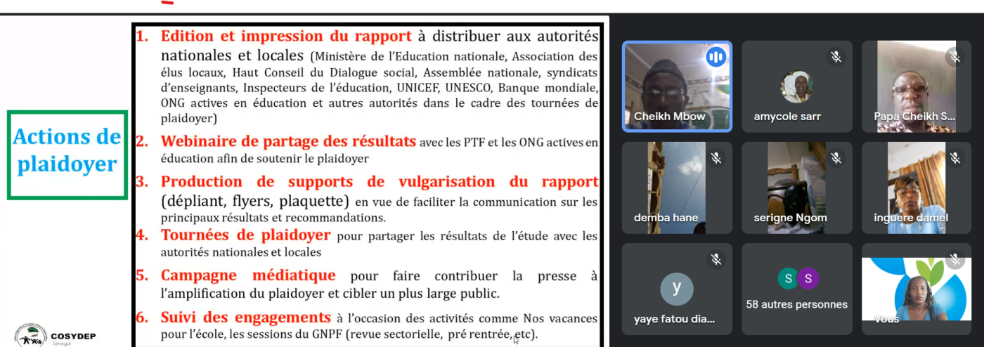 On 21 July 2022, GI-ESCR participated in a webinar organised by its partner Coalition des Organisations en SYnergie pour la Defense de l’Education Publique (COSYDEP) which gathered 15 in-person participants and 69 online participants including UNESCO, ActionAid, the Senegal High Council for Social Dialogue, ANCEFA and many more francophone civil society organisations.