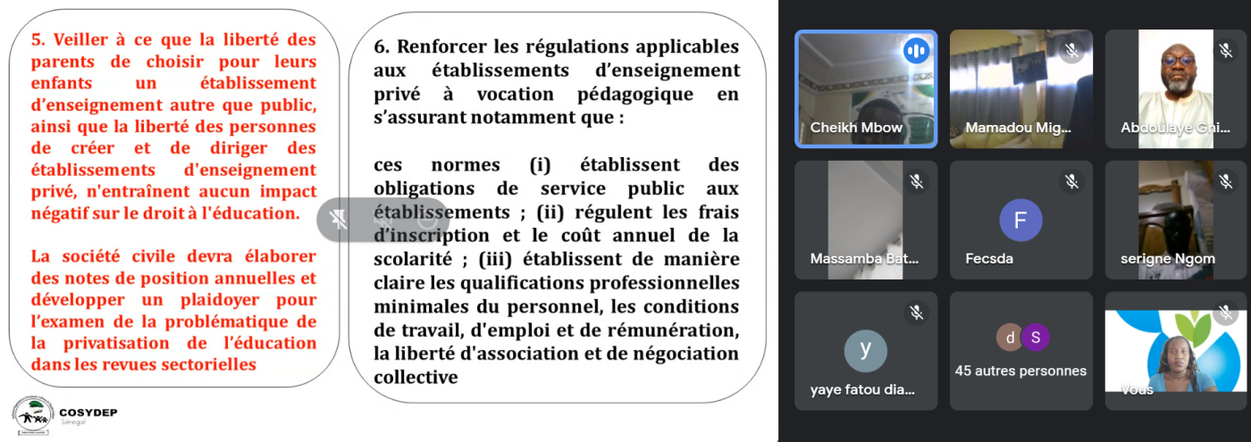 The aim of the webinar was to present the findings and recommendations of the report on the privatisation and commercialisation of education in Senegal launched in 2021 that GI-ESCR supported as well as the advocacy plan by COSYDEP.