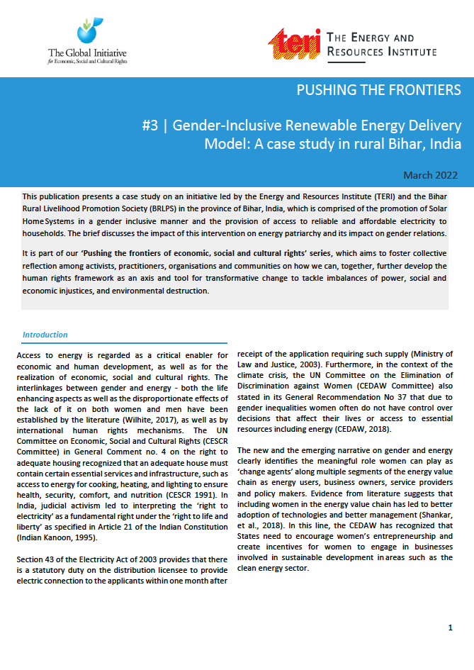The third edition contains a contribution by the Energy and Resources Institute (TERI) on an energy intervention conducted in Rural Bihar, India comprised of the promotion of Solar Home Systems in low-income communities. The brief discusses the impact of this local intervention on energy patriarchy and on gender relations critically examining its potential to improve women’s livelihoods and transform uneven power relations between local women and men.