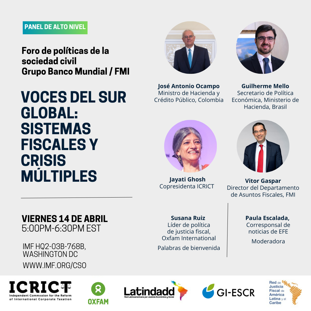 El pasado viernes 14 de abril de 2023, GIESCR estuvo presente en el panel de alto nivel “Voces del Sur Global: sistemas fiscales y crisis múltiples”, en el marco de las Reuniones Anuales de primavera del Banco Mundial y el FMI.