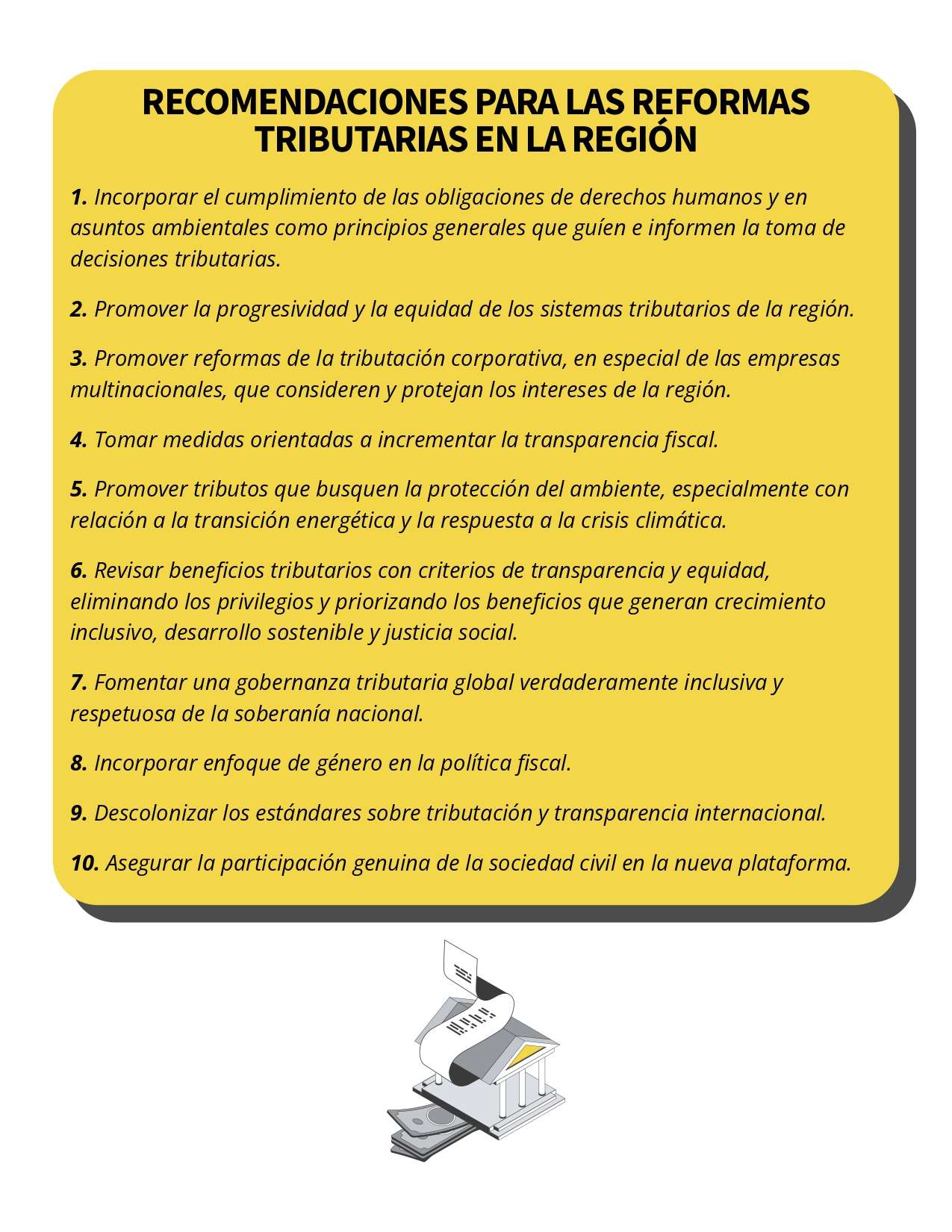 Reconociendo el impacto de los recursos tributarios para alcanzar justicia en todas sus dimensiones: económica, social, laboral, política, climática, cultural, racial, de género, y regional y holístico-territorial, exhortamos a los Estados a impulsar