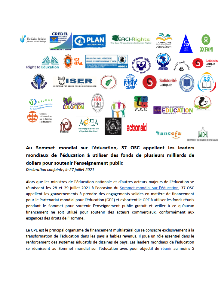 In a statement accompanying the brief, we call on the Global Partnership for Education to use the money raised during the Global Education Summit (28-29 July), to support free public education and ensure that no funding is used to support commercial actors, in accordance with human rights requirements.
