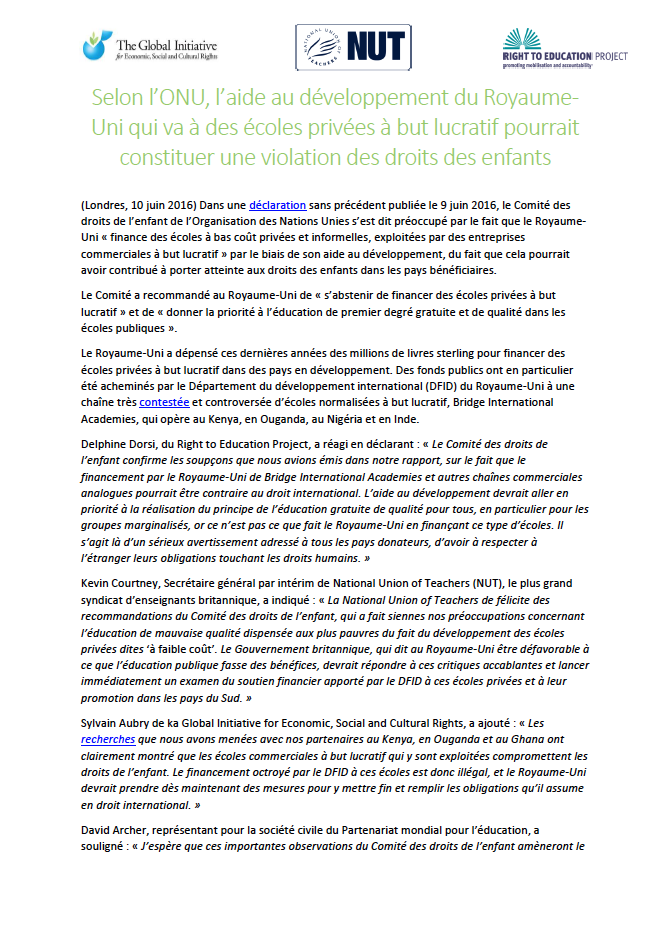 Selon l’ONU, l’aide au développement du Royaume-Uni qui va à des écoles privées à but lucratif pourrait constituer une violation des droits des enfants